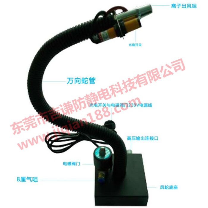 吉謙設備廠研發的除靜電離子風蛇是一種高效、快速的除靜電設備。具有除靜電快、蛇管可隨意變形指向目標方位,無需用手操作可讓離子氣流直接吹向目標表面,風力大、除靜電除塵效果好。