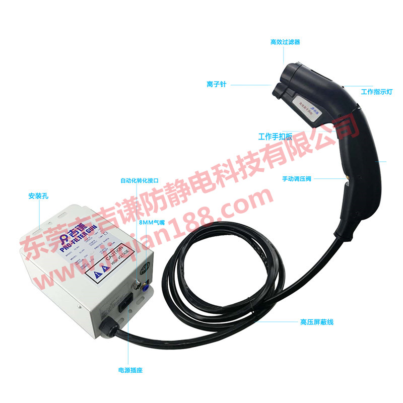 JQ-669蛇形風槍可產生大量的學有正負電荷的氣流,可以將物體上所帶的電電荷中和掉,當物體表面所帶為負電荷時,它會吸引氣流中的正電荷,當物體表面所帶為正電荷時它會吸引氣流中的電荷,從而使物體表的靜電被中和,達到消除靜電的目的
